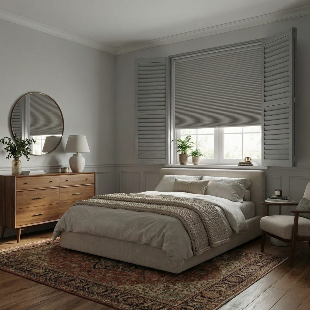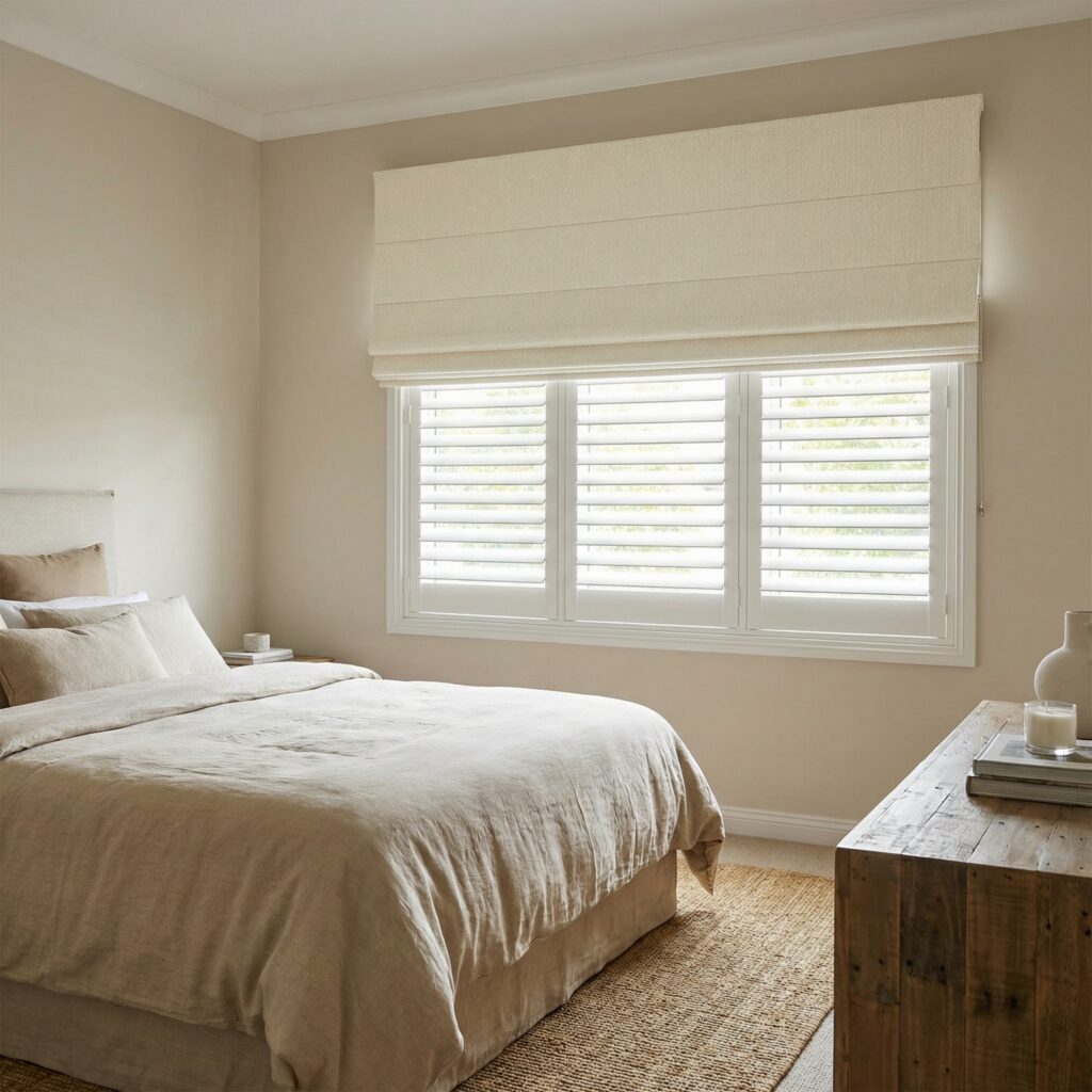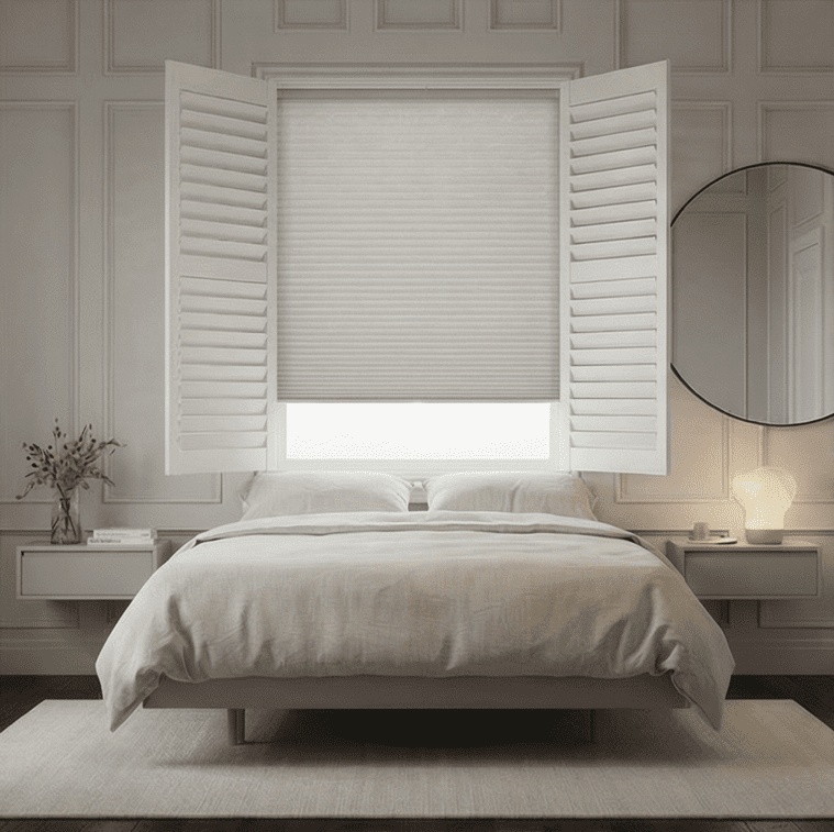 This approach softens the look of shutters while significantly improving light control and insulation. It also creates a layered, hotel-like feel that works beautifully in bedrooms.