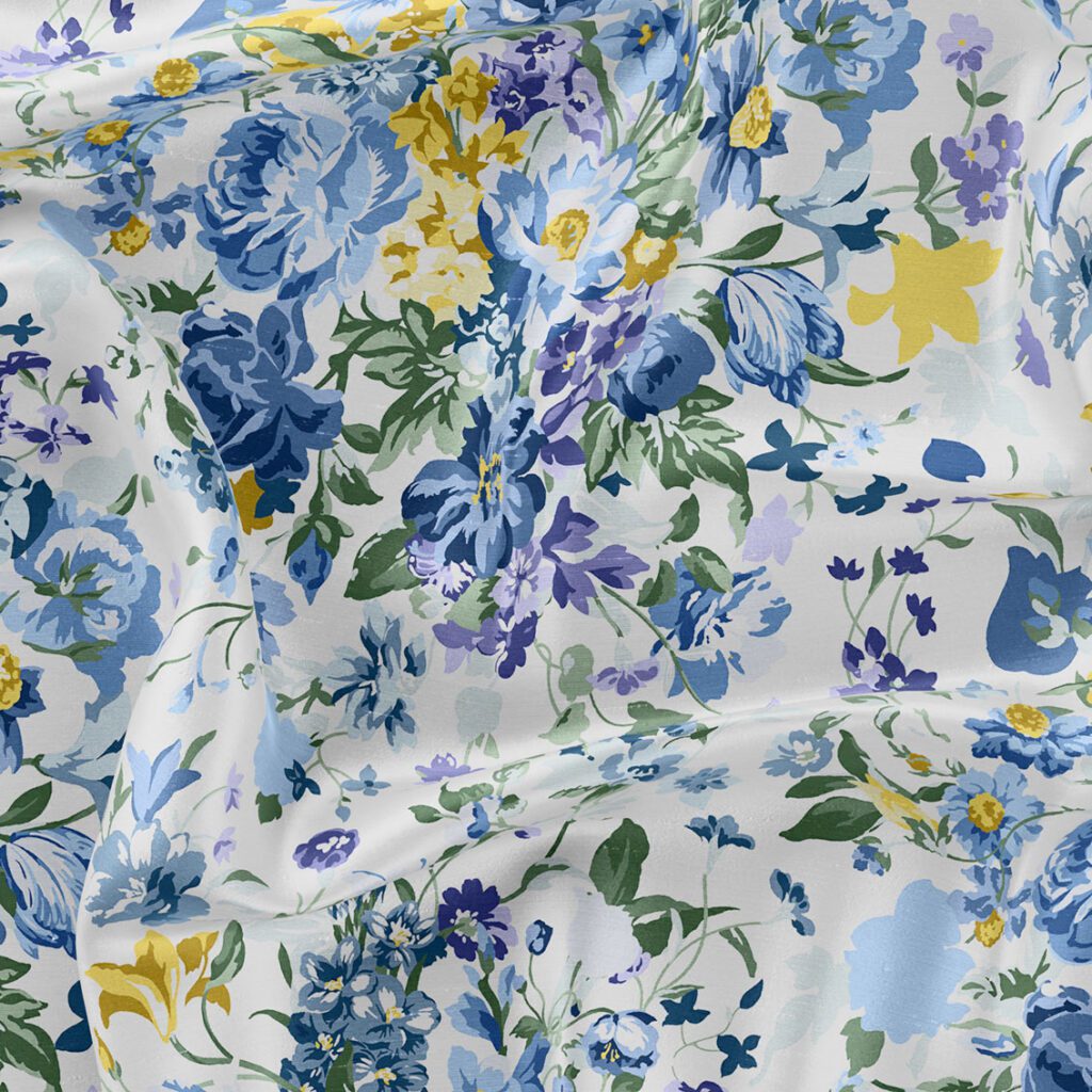 Regency Trail honours Liberty’s illustrious legacy of Tree of Life-style designs, drawing inspiration from a hand-painted artwork dating back to 1969. Meticulously reimagined, the design is characterised by trailing branches adorned with majestic peonies, chrysanthemums, carnations, blossom, and fuchsia, nestled among lush foliage. An interplay of tonal shades adds contrast, depth, and definition, enveloping the pattern in an aura of mystery and refinement.